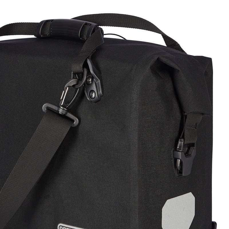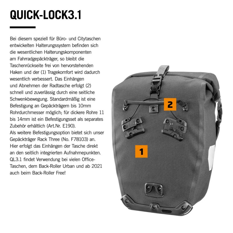 Noch komfortabler und schneller, sowohl beim Einhängen als auch beim Aushängen: Quick-Lock3.1 stellt eine weitere Entwicklungsstufe im System der Ortlieb-Befestigungssysteme dar. Die Tasche wird nur am unteren Aufnahmepunkt aufgesetzt und anschließend oben von links oder rechts in die Halterung eingeschwenkt und arretiert. Schon sitzt die Office-Bag QL3.1 sicher am Gepäckträger. Abnehmen ist ebenso kinderleicht: Am Griff ziehen, schwenken, fertig!