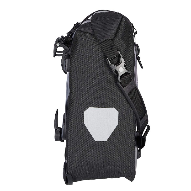 Aufhängung für Gepäckträger mit einem Rohrdurchmesser von 8 bis 16 mm. Beim QL2.1-System wurde die Schiene mit den Befestigungshaken an der Taschenrückseite überarbeitet. Die beiden oberen Haken lassen sich werkzeugfrei auf der nun aus einem Stück gefertigten Schiene verschieben und durch Anheben des Tragegriffs öffnen. Der untere Arretierungshaken ist ebenfalls auf einer halbelliptischen Schiene individuell anpassbar und werkzeugfrei in 15°-Schritten drehbar. Ein Scheuerschutz im unteren Bereich der Taschen und an der Auflagefläche des Gepäckträgers beugt Abrieb vor.
