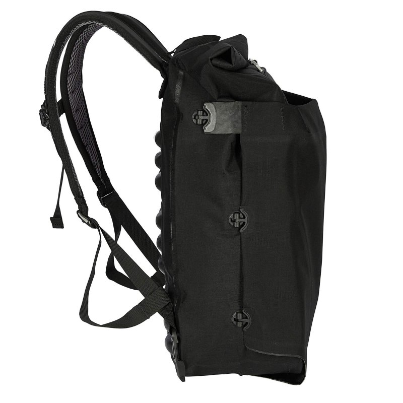 Die Mechanik beim Vario Plus 26L QL2.2 ist bestechend einfach und funktioniert prima: Die Packtasche hat auf einer Seite Rucksack-Tragegurte, auf der anderen das verbesserte Quick-Lock 2.2-System für deinen Gepäckträger. Der Clou ist das Flap: Dieser flexible Deckel ist mittig an der Seite und am Boden der Vario Plus beweglich angeschlagen. Entweder deckt das Flap also das Quick-Lock 2.2 System ab, oder aber die Tragegurte.