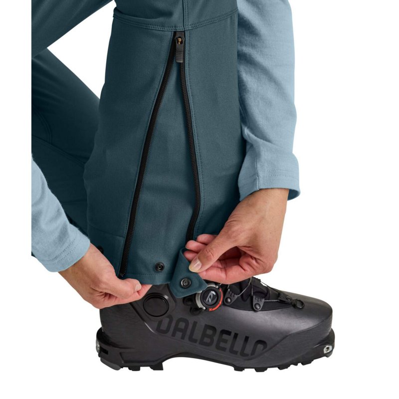 Der teilelastische Bund ist mit weicher Merinowolle versehen und sorgt für reibungslosen Sitz. Die Weite kannst du bequem per Klettverschluss regulieren. Auch die Beinabschlüsse lassen sich per Reißverschluss und Druckknöpfen einstellen. So passen sie bequem über die Skischuhe. Vorgeformte, elastische Kniepartien erhöhen die Bewegungsfreiheit und sorgen gemeinsam mit dem ergonomischen Schnitt für ungebremsten Tourenspaß.