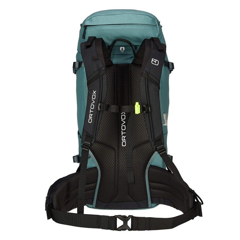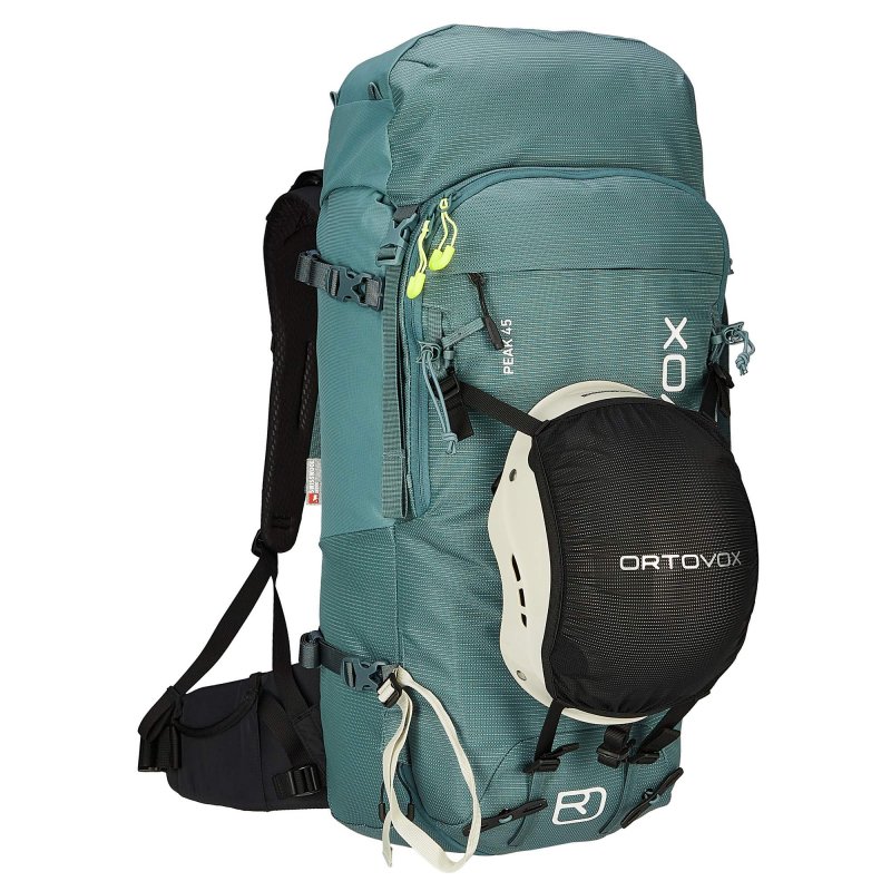 Ortovox hat dem Peak 45 ein neues Tragesystem verpasst, das Swisswool 3D Back System. Dafür wurden Wollvlies, ergonomische Schaumeinsätze und ein 3D-geprägtes Obermaterial clever kombiniert. Das Ergebnis ist ein Kontaktrücken, bei dem du trotz des festen, körpernahen Sitzes ein trockenes Tragegefühl hast. Denn an allen Kontaktpunkten befinden sich Wollpads und Wolle hat den Vorteil, dass sie bis zu 30 Prozent ihres Eigengewichts an Feuchtigkeit aufnehmen kann. Die Wollpads kommen übrigens auch an Schulter- und Hüftgurten zum Einsatz.