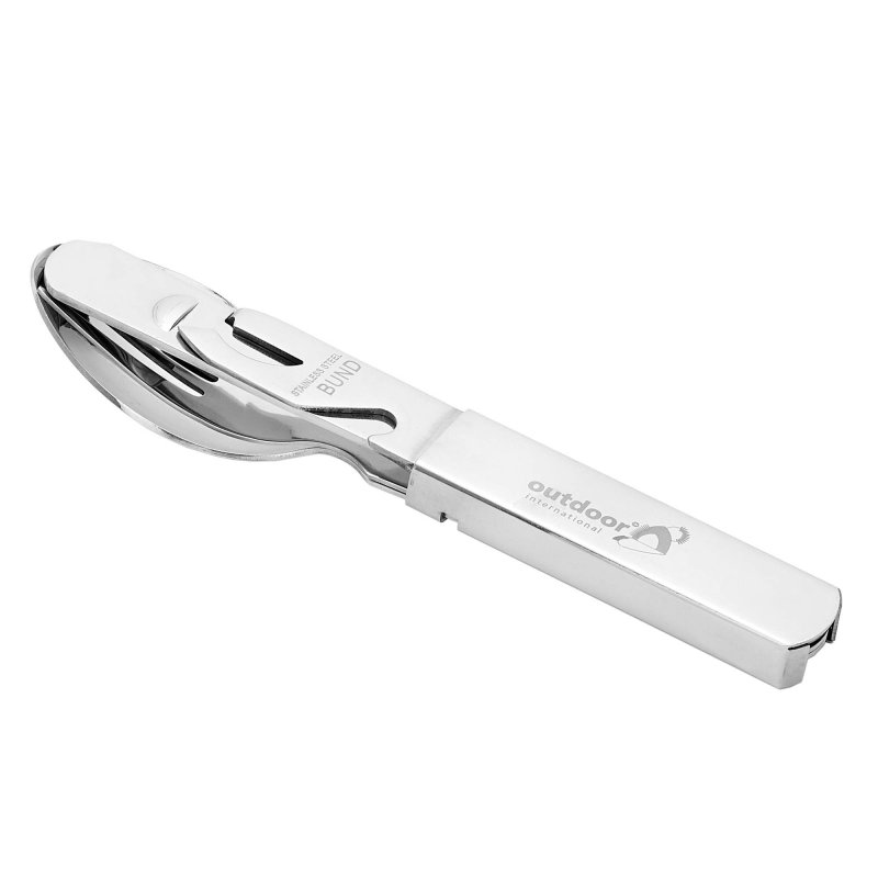 Klassische Edelstahl-Ausführung in Anlehnung an das berühmte Bundeswehr-Besteck: Messer, Gabel und Löffel arretieren in der Halterung, die du auch als Dosen- und Flaschenöffner verwenden kannst.