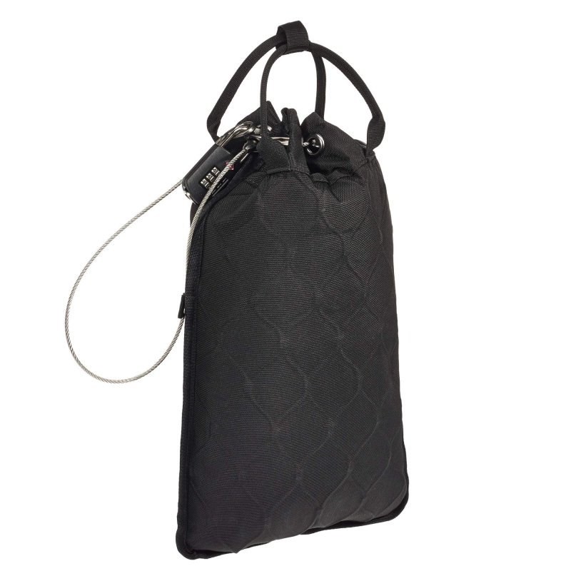 Voraussetzung dafür sind natürlich feste, unbewegliche Gegenstände. Das Exomesh-Gewebe (Exomesh Slashguards) aus Edelstahl-Stahlseilen macht den Beutel aufschlitzsicher. Leer ist der Travelsafe 5L GII etwa auf ein Drittel seiner Größe zusammenfaltbar.