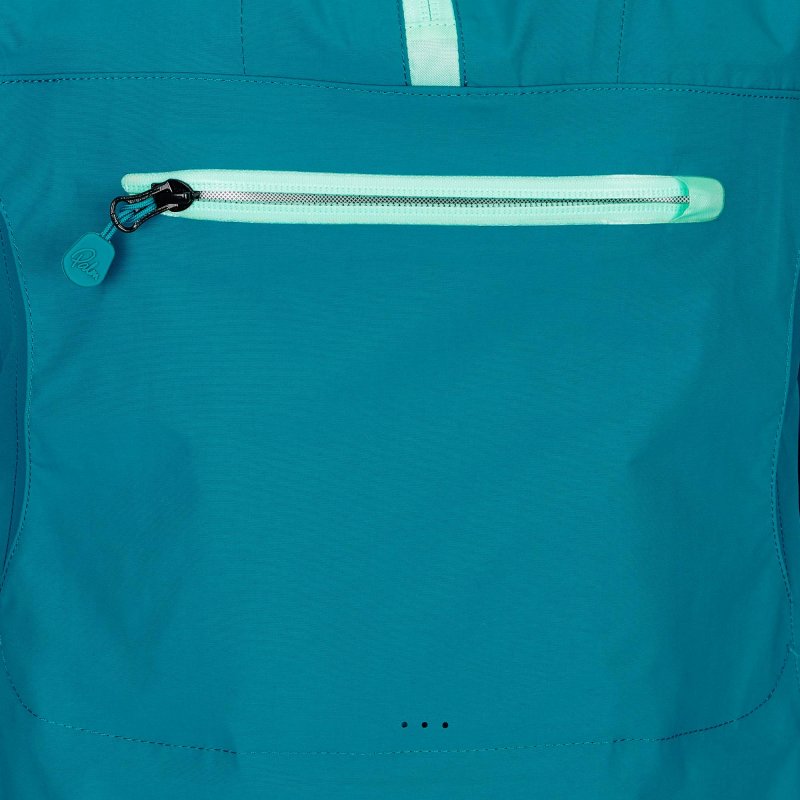 Die Schlupfjacke ist mit einem halblangen YKK AquaGuard Zipper ausgestattet und auf dem Wasser schnell übergezogen. Am Rücken ist sie deutlich länger geschnitten, so dass sie beim Sitzen im Kanu gut abdeckt. Schulterpartien sind speziell auf die Paddelbewegung abgestimmt. Der Bund lässt sich per Kordelzug justieren und die Ärmelbündchen per Klett anpassen.