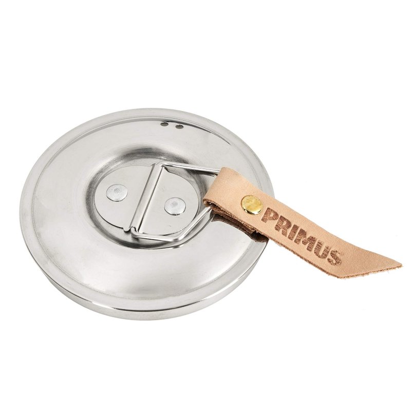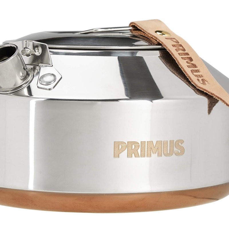 Die Außenseite des Bodens ist mit einer Kupferschicht versehen, die die Wärme des Kochers effizienter verteilt. Dadurch wird das Wasser schneller zum Kochen gebracht, und zugleich spart man Brennstoff. Der Deckel verfügt über einen klappbaren Metallhenkel und ein Leder-Tag mit Primus-Logo.