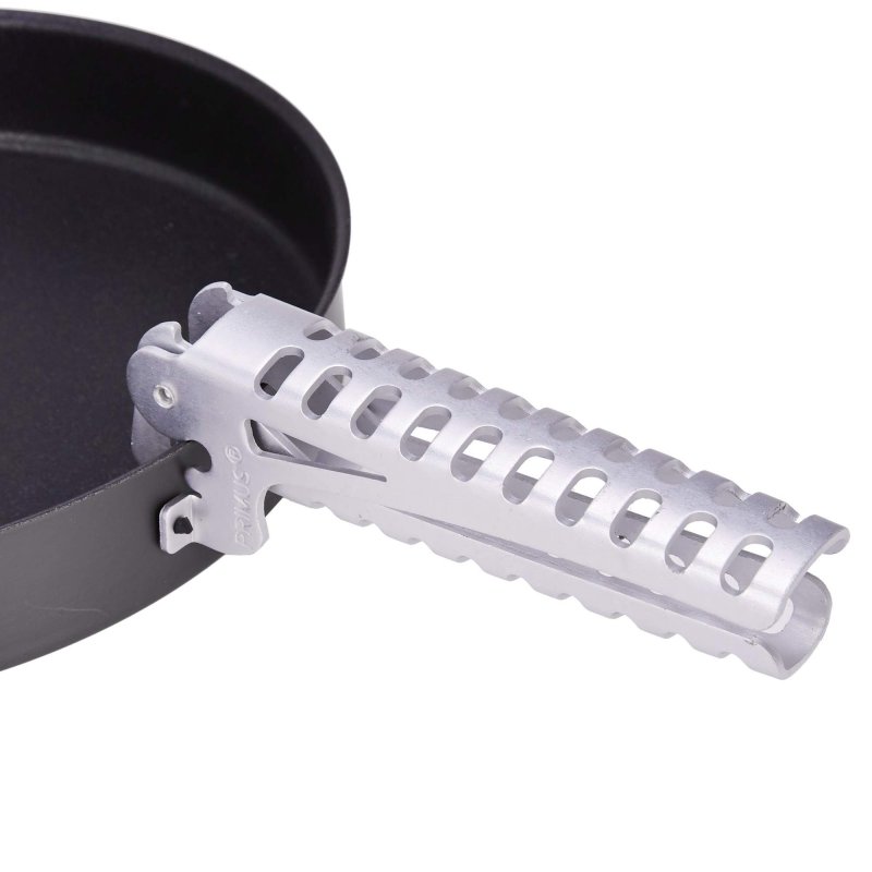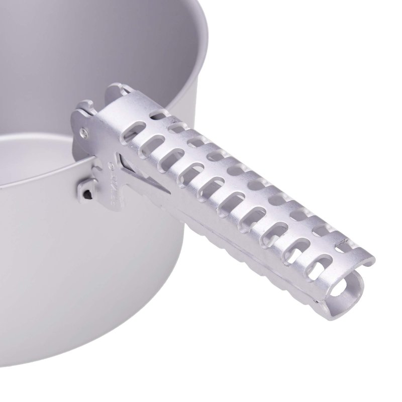 - Windschutz mit Gasbrenner, 2x 2,3 Liter Aluminiumtöpfe, Beschichtete Pfanne, Griffzange, Anleitung