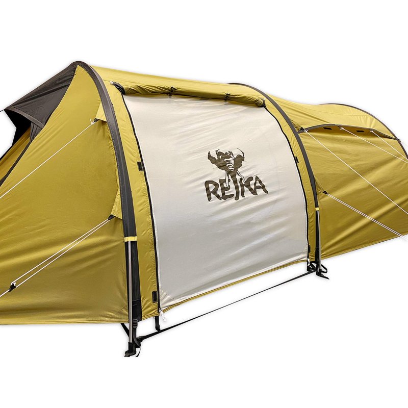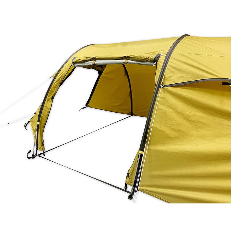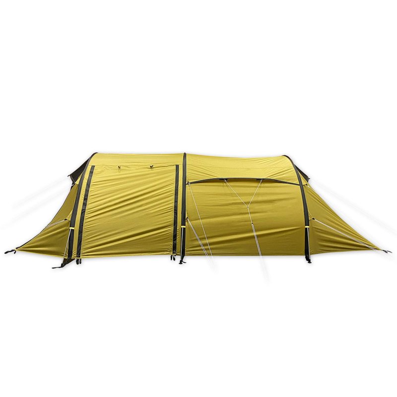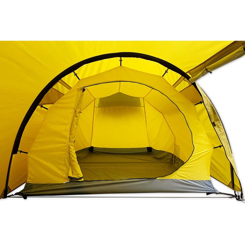 Mit seinem robusten, PU-beschichteten Außenmaterial sowie Seitenwänden, die bis auf den Boden heruntergezogen sind, schützt dich das Antao III zuverlässig vor Regen und Wind. Gleichzeitig hellt der gelbe Zeltstoff die Innenraum-Atmosphäre auf. Vier Belüftungsöffnungen lassen Luft im Inneren zirkulieren. So wird Kondensbildung minimiert und das Raumklima optimiert. In warmen Nächten kannst du den Eingang komplett hochrollen und nur mit der Moskitogaze verschließen.