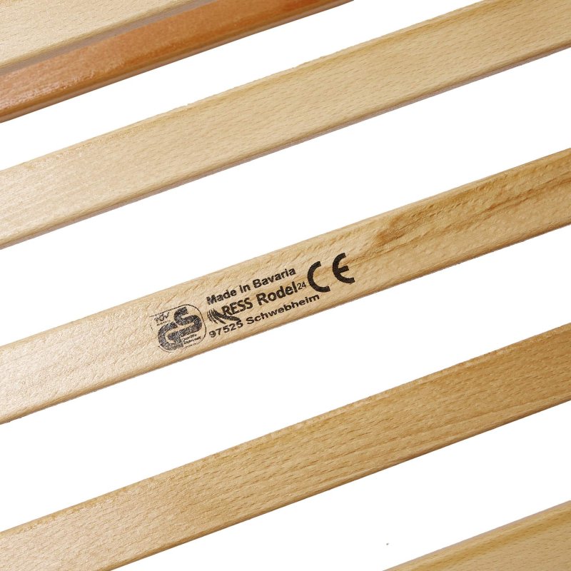 Alle Stahlteile, also Kufen, Schrauben, Stütz- und Zugeisen, bestehen aus verzinktem Stahl. Die Kufen und Böcke sind aus Buchen-Formholz gefertigt, der Lattensitz aus Buche-Massivholz. Der Schlitten ist für 1-2 Personen geeignet.