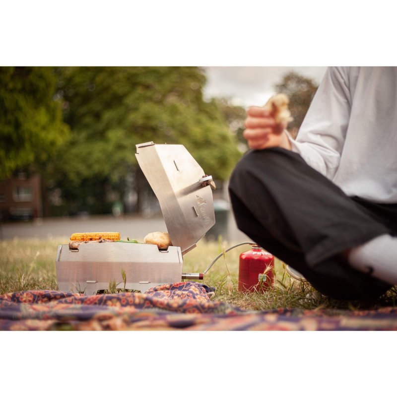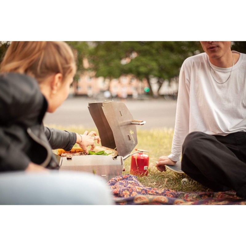 Selbst die Grillzange aus Bambus ist mit Funktionen ausgestattet. So dient sie nicht nur zum Drehen und Wenden des Grillguts, sondern fungiert eingesteckt in den Deckel gleichzeitig als Griff. Um die Wartezeit bis zum perfekten Garpunkt zu verkürzen, kannst du dir mit dem integrierten Flaschenöffner ein kühles Getränk öffnen.