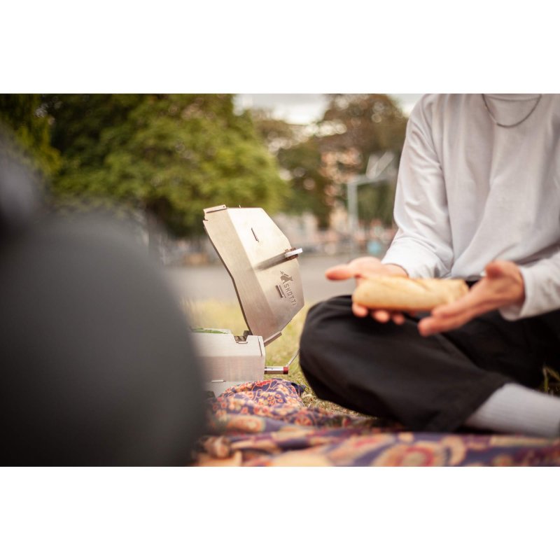 Skotti-Typisch ist alles flach verpackbar, damit du ihn problemlos in der Tasche oder einem Rucksack transportieren kannst. Im Lieferumfang enthalten ist eine Planentasche. Wenn du möchtest, kannst du den Cap inkl. Grill aber auch in der Planentasche des Grills transportieren.