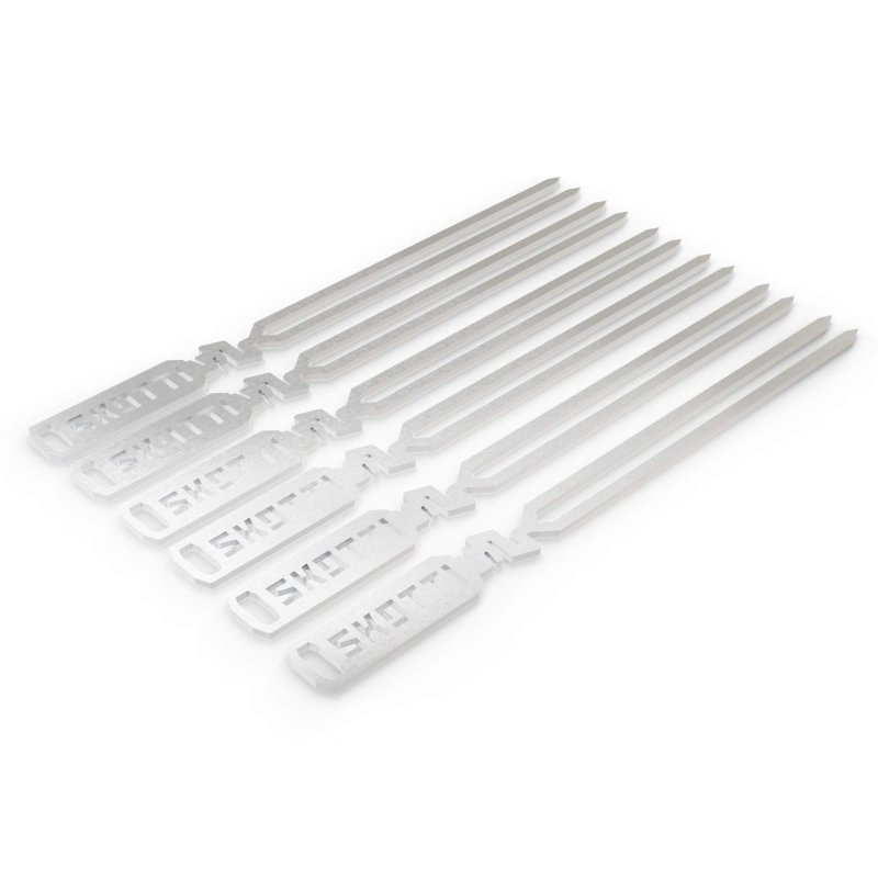 Die Skotti Pikes bestehen aus hochwertigem Edelstahl und können quer und längs verwendet werden. Die Doppelspieß-Funktion verhindert ein Mitdrehen des aufgespießten Grillguts.