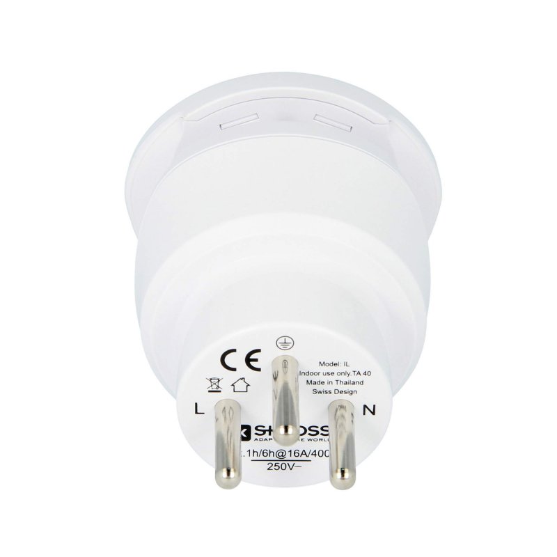 Dieser Reisestecker bietet einen Ausgang für Stecker aus Europa (Schuko) und Israel und ist auch für energieintensive Geräte wie Notebooks und Föns geeignet.