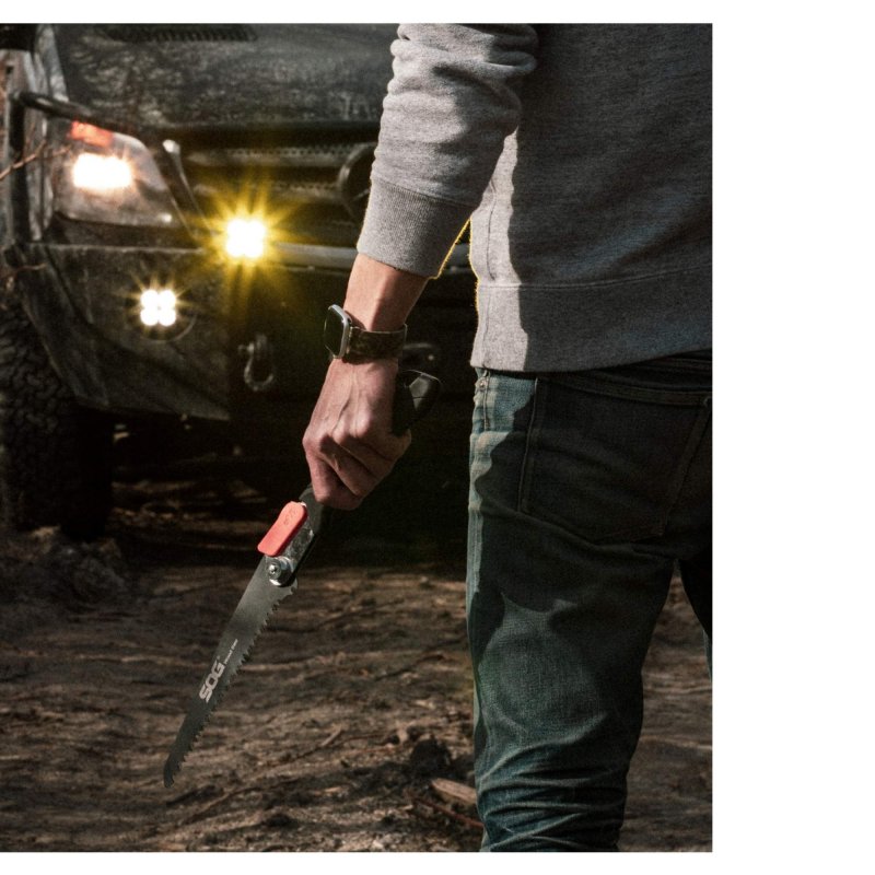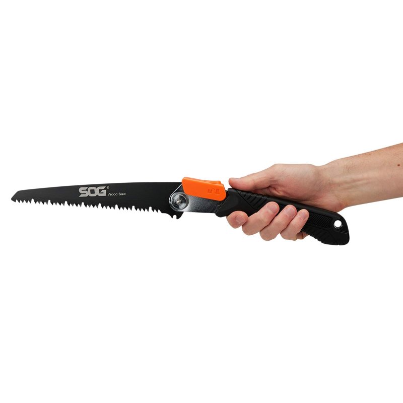 Die SOG Klappsäge bietet mit einer Länge von 44 cm eine gute Balance zwischen Nutzbarkeit und Verstaubarkeit. Ihre 21 cm lange, gehärtete Sägeklinge eignet sich zum Sägen von Ästen und kleinen Stämmen.