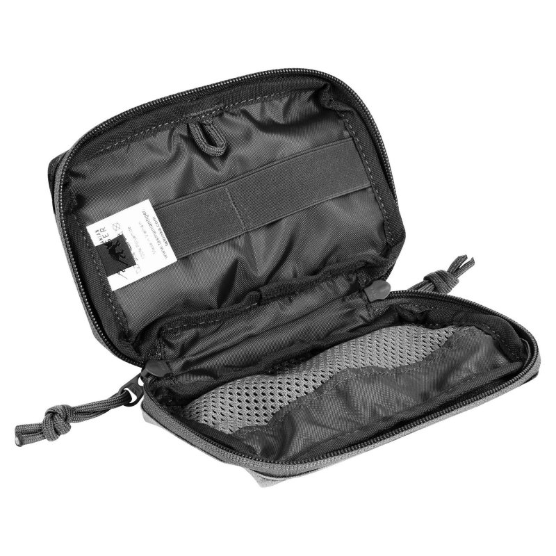 Zubehörtasche mit den Außenmaßen 10 x 15 x 4 cm, einer großen öffnung und MOLLE-Reverse-System. Innen befinden sich eine Netztasche sowie elastische Schlaufen.