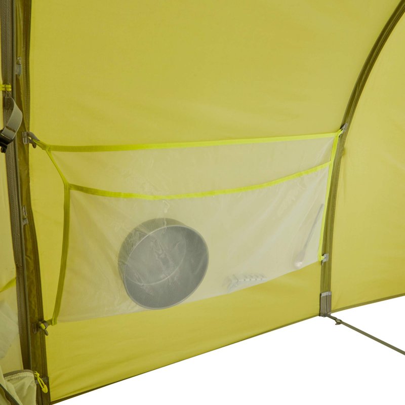 Alle Lüfter sind mit einem Moskitonetz versehen. Den Apsislüfter kannst du jedoch zur besseren Ventilation komplett öffnen. In der Apsis befindet sich ein großer Gear Loft und eine große Seitentasche, in der du schnell benötigte Ausrüstung verstauen kannst. Das Innenzelt bietet zwei Personen ausreichend Platz zum Schlafen. Die vielen Seitentaschen verstauen dabei Bücher, Taschenlampe, Brille und andere Kleinteile. Sollte deine Kleidung feucht sein, kannst du sie auf der integrierten Wäscheleine trocknen. Zusätzliche Schlaufen ermöglichen dir auch mehrere Leinen im Innenzelt zu spannen oder eine Zeltlaterne aufzuhängen.