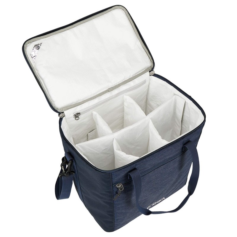 Kühltasche mit 25 l Volumen und herausnehmbarer, gepolsterter Unterteilung, um bis zu sechs Flaschen sicher transportieren zu können. Zwei Tragegriffe und ein Schultergurt erleichtern den Transport.