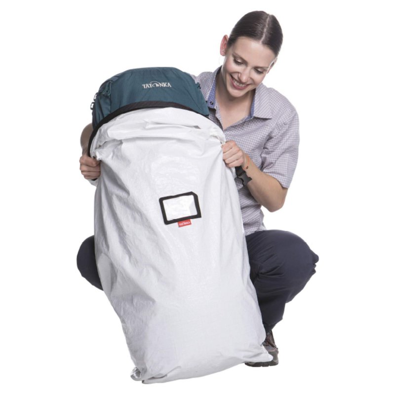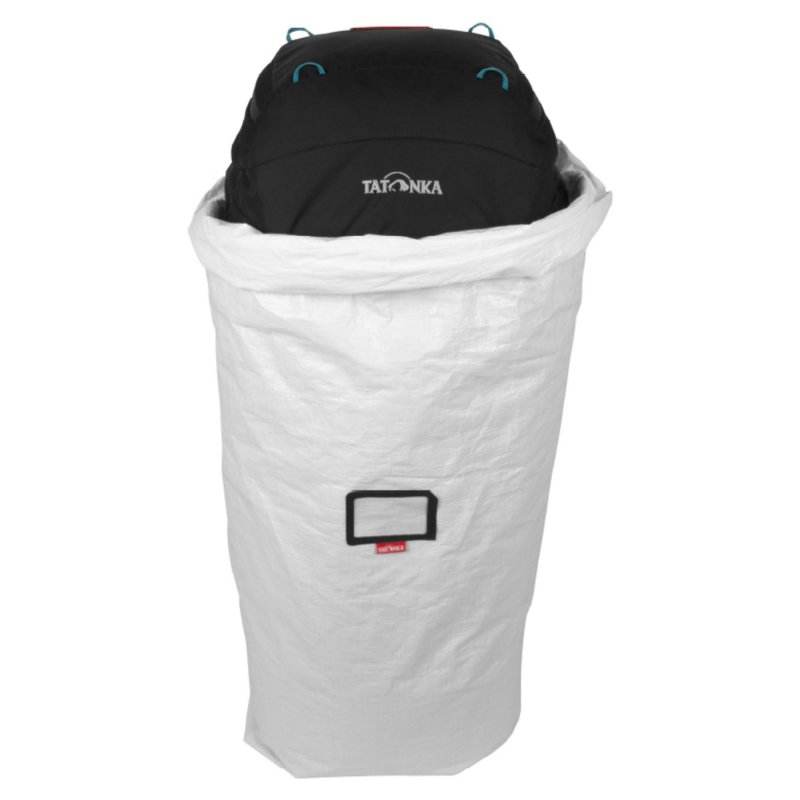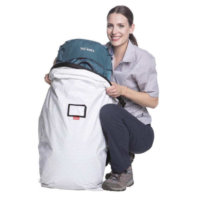 Stabile Rucksack-Schutzhülle mit Rollverschluss und Klarsichtfach für Namensschild. Ideal für den Flugzeug-Transport. Geeignet für Rucksäcke bis 130 Liter.