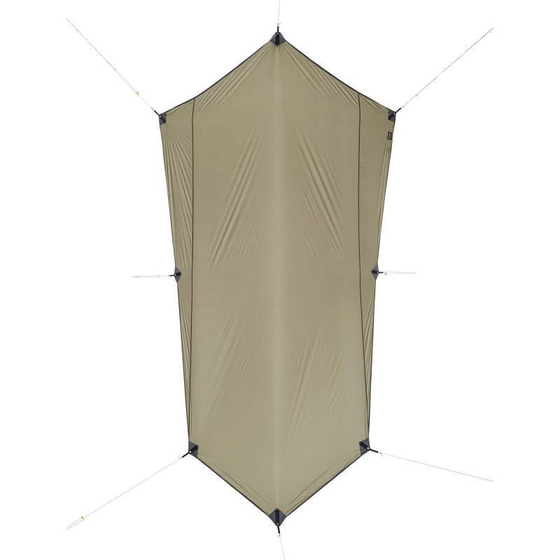 Der Schnitt erlaubt eine Vielzahl an Aufstellvarianten. Tief abgespannt schützt es Schlafsack und Ausrüstung vor Wind und Regen, hoch abgespannt bietet es eine geschützte Fläche zum Kochen oder gemütlichen Beisammensitzen.