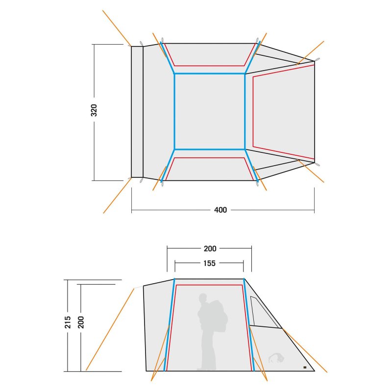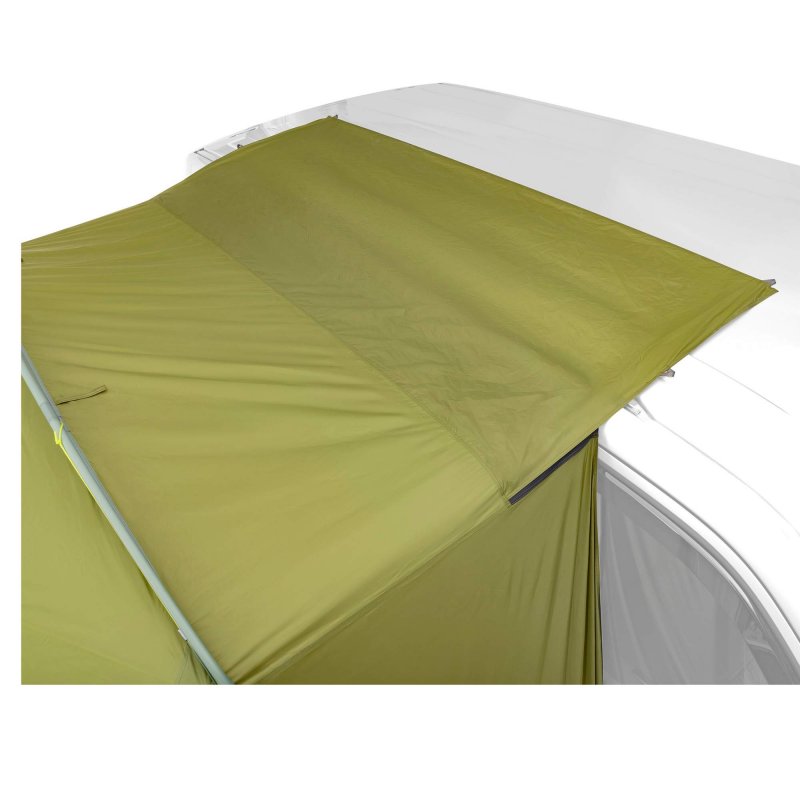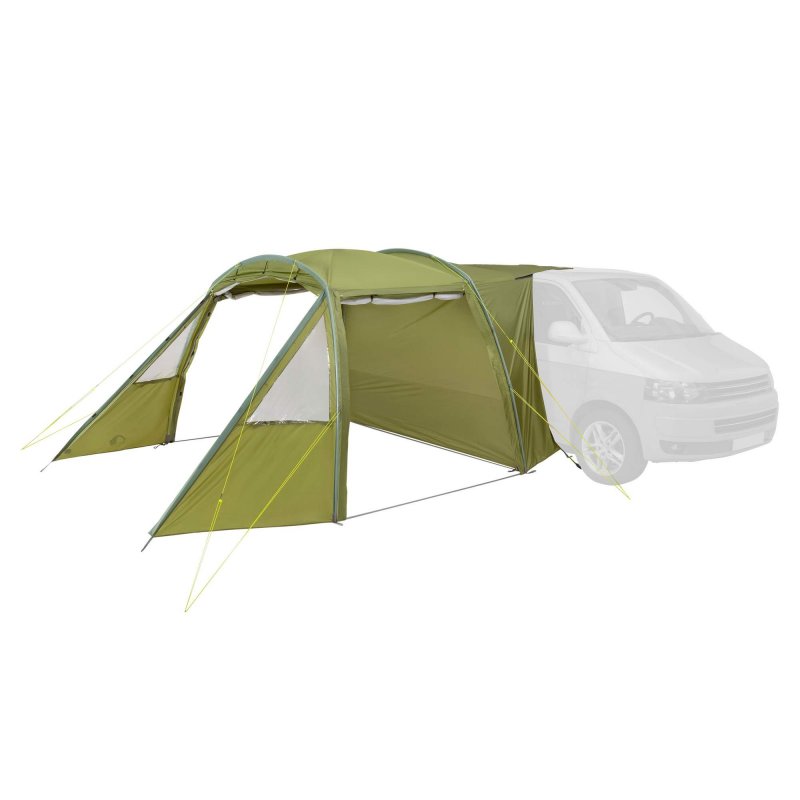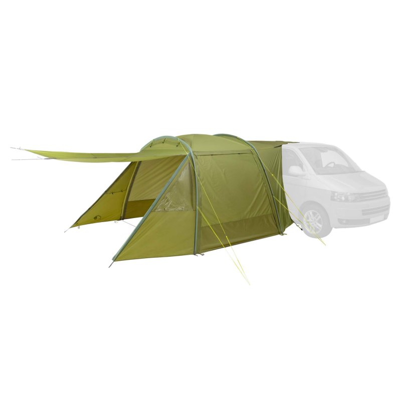Das Tatonka Van Camp ist ein stehhohes Vorzelt für den Anbau an unterschiedliche Camping-Busse. Das Zelt mit Tunnelkonstruktion wird mit zwei Gestängebögen aufgestellt und mithilfe eines Keder-Adapters in die Kederschiene des Busses eingezogen. Zwei weitere Gestängebögen, die über Kreuz im Innern des Zelthimmels fixiert sind, sorgen für zusätzliche Stabilität. Das Van Camp verfügt über einen Frontzugang mit Doppelreißverschluss sowie über Zugänge auf beiden Seiten. Alle drei Seiten können hochgerollt, als Sonnendach aufgespannt oder mit separaten Moskitonetzen verschlossen werden. Zwei Fenster im Vorzelt sorgen für gute Lichtverhältnisse, selbst wenn das Zelt komplett geschlossen ist. Der in der Rückwand integrierte Zugang zum Bus kann ebenfalls mit einem Reißverschluss verschlossen werden.