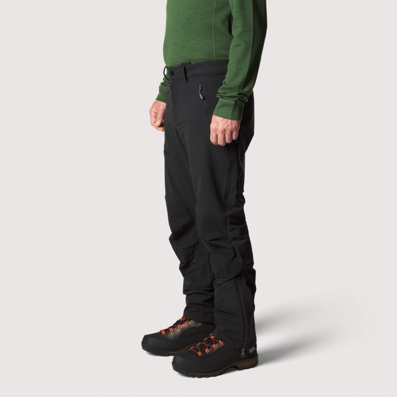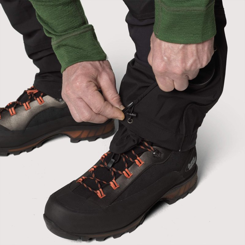 Aber auch auf den Brettern oder am Fels überzeugt sie. Die Hose lässt sich im Knöchelbereich per Reißverschluss erweitern, sodass sie auch mit Skistiefeln gut passt. Stiefelhaken halten alles an Ort und Stelle. Und die Weitenregulierung ermöglicht dir einen freien Blick auf den Fels beim Kraxeln. Des Weiteren ist das Material der Ace Pant schön elastisch und äußerst atmungsaktiv. Kommst du auf anstrengenden Etappen ins Schwitzen, transportiert die Tourenhose die Feuchtigkeit schnell nach außen und sorgt für einen trockenen Tragekomfort.