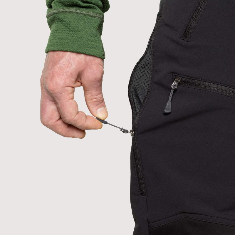 Die robuste Softshellhose ist windabweisend und dauerhaft wasserabweisend imprägniert (PFC-frei). An den stärker beanspruchten Stellen (Gesäß, Knie und Knöchelbereich) ist die Ace Pant zusätzlich mit einer 3-lagigen Polyamid-Verstärkung mit PU-Membran versehen. So kannst du auch durch nasses Gras streifen oder dich in der Pause auf den feuchten Untergrund setzen.