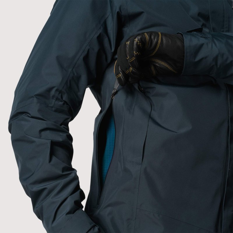 Die beiden Eingrifftaschen und die Brusttasche sind leicht zugänglich und eignen sich perfekt dazu, auf Touren die wichtigsten Dinge unterzubringen. Dank der Belüftungsreißverschlüsse an den Seiten kannst du überschüssige Wärme leicht nach außen entweichen lassen. Die dreifach verstellbare Kapuze, der Kordelzug am Saum der Jacke und die Klettverschlüsse an den Ärmelbündchen halten Wind und Feuchtigkeit ab. Der Zwei-Wege-Frontreißverschluss mit Druckknopf an der Unterseite ermöglicht es, die Jacke von unten zu öffnen, während der Knopf sie zusammenhält, wodurch überschüssige Wärme entweichen kann.