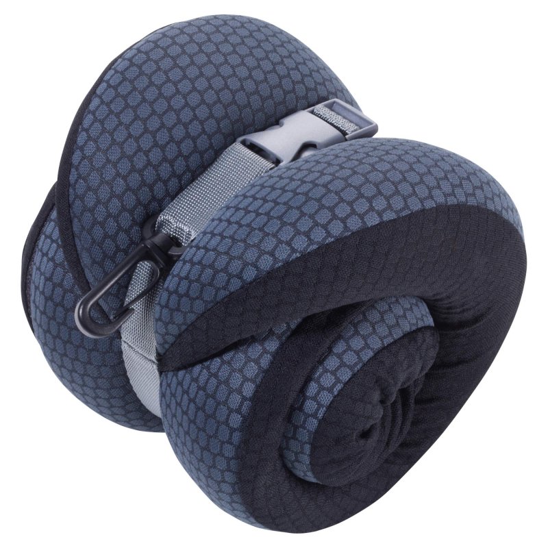 Das Nackenkissen lässt sich platzsparend zusammenrollen und stützt den Kopf durch einen formstabilen Memoryschaum. Auf der Vorderseite kann das Nackenkissen fixiert und an den Halsumfang angepasst werden.