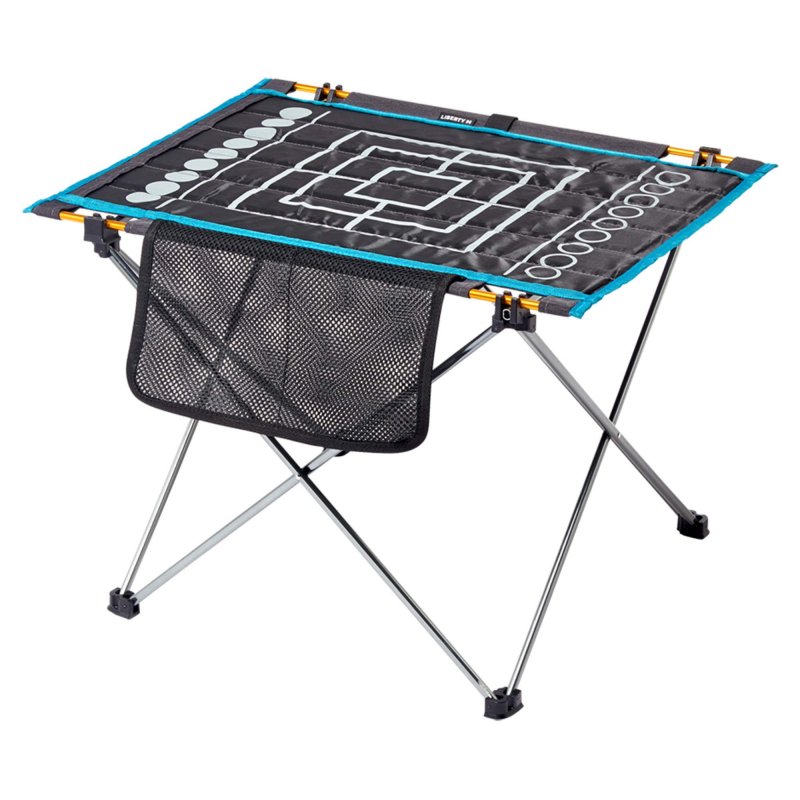 Die Tischplatte besitzt eine Fläche von 55 x 42 cm. So kannst du am Tisch bequem mit deinen Freunden Karten spielen, Essen zubereiten oder kochen. Und sie ist außerdem wendbar: Auf der Rückseite trägt sie einen praktischen Spielbrett-Aufdruck. Damit steht dem Outdoor-Spieleabend nichts im Wege. Eine praktische Netztasche für allerlei Utensilien komplettiert den Liberty M.