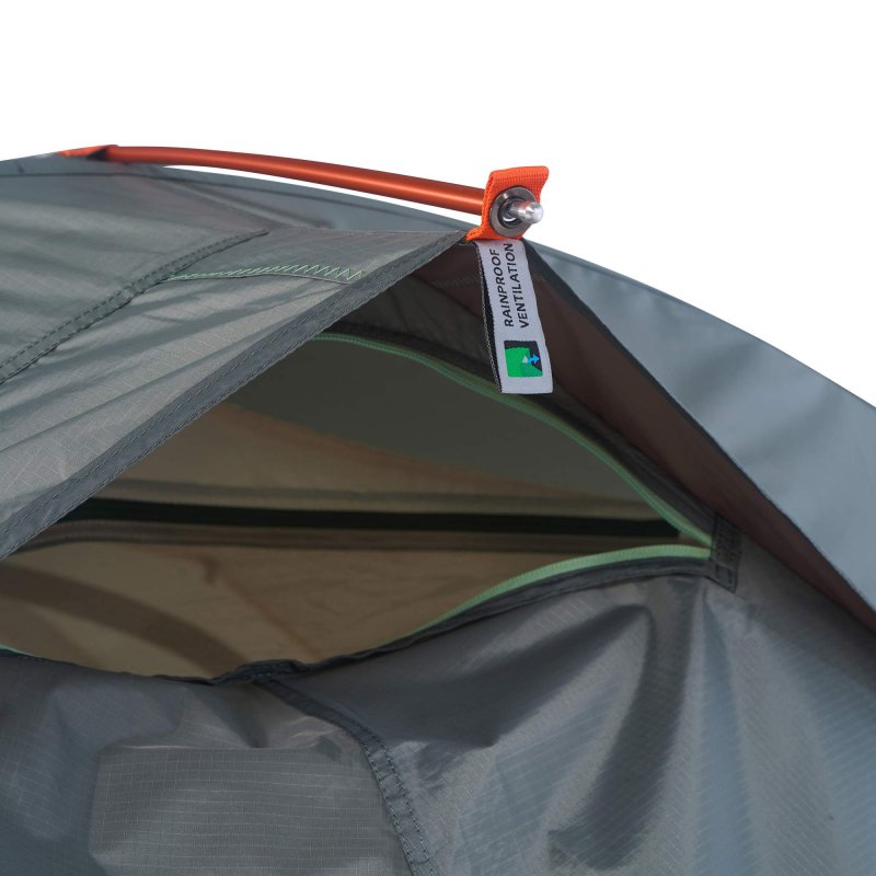 Ein einfacher Aufbau bei milder Witterung gelingt mit nur zwei Heringen, die jeweils an einer Apside befestigt werden. Erwartest du hingegen schlechtes Wetter, kannst du das Zelt mit bis zu zehn Heringen abspannen. Die geräumigen Apsiden bieten ausreichend Platz für deine Ausrüstung und verfügen über zwei Eingänge, sodass du das Zelt immer zur windabgewandten Seite verlassen kannst. In die Eingänge sind zwei Lüfter integriert, die du bei Bedarf verschließen kannst.