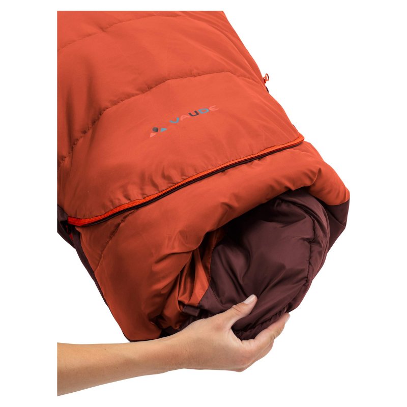 Auch der Schlafkomfort lässt keine Wünsche offen. Ein gefütterter Wärmekragen mit elastischem Schnürzug hält die aufgewärmte Luft im Schlafsack. In besonders kalten Nächten kann auch die Kapuze eng zusammengezogen werden, wodurch der Kopf schön warm bleibt. Kältebrücken werden durch die gefütterte Reißverschlussabdeckung verhindert, die auch Arme und Beine vor dem kühlen Reißverschluss schützt.