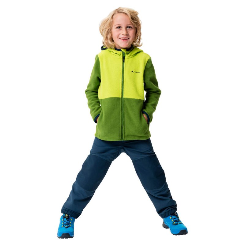 Die Fleecejacke in mitteldicker Stärke (200er) spendet angenehme Wärme, wenn es draußen kühl wird. Die Kapuze schützt Kopf und Ohren vor kaltem Wind. Bei nasskaltem Winterwetter kann sie auch einfach in eine wasserdichte Außenjacke von Vaude eingezippt werden und schwuppdiwupp entsteht eine warme, wasserdichte Doppeljacke.