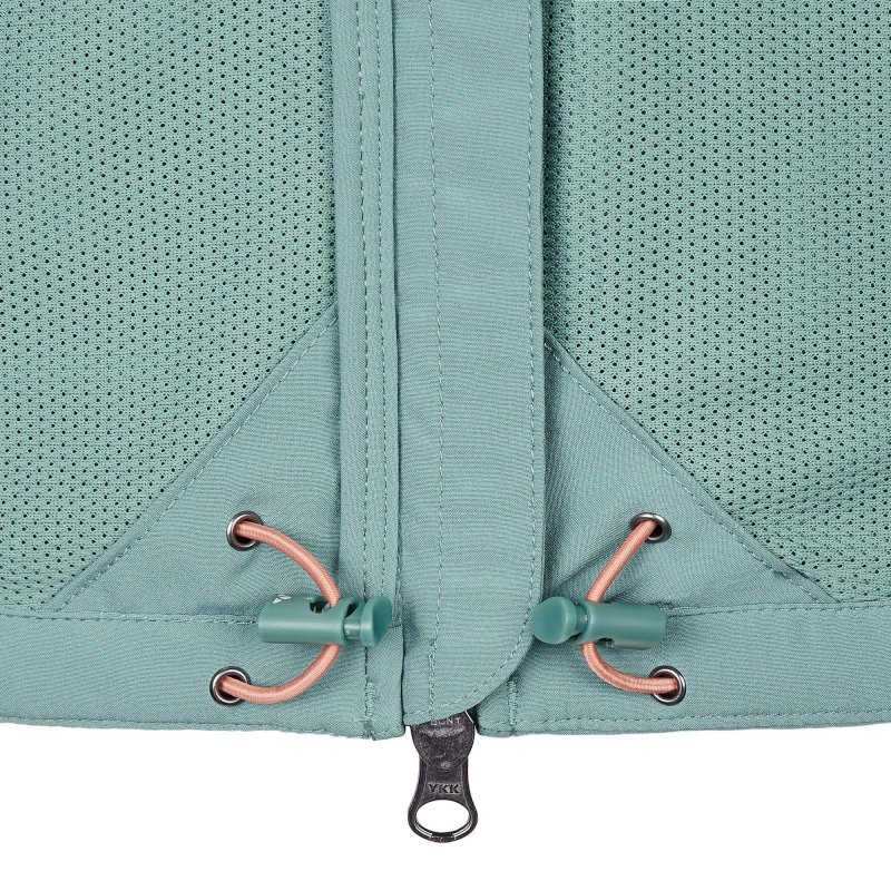 Äußerst nützlich bei anstrengenden Passagen ist die Unterarmbelüftung, die mit einem 2-Wege-RV ausgestattet ist und für Durchzug sorgt. Die RV-Taschen sind mit einem Mesh-Futter versehen und tragen somit auch zu einem guten Trageklima bei. Der 2-Wege-Front-RV sorgt für Komfort und der regulierbare Saum und die Ärmelabschlüsse verleihen der Softshell einen sicheren Sitz.