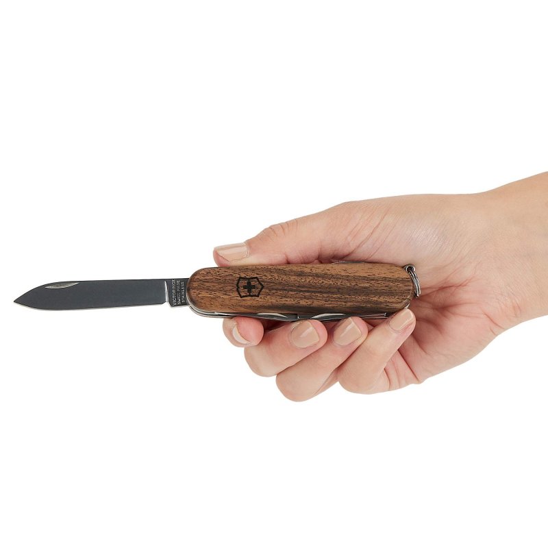 Das Walnussholz dieses Messers stammt aus europäischen Wäldern. Es sieht durch seine feine Maserung nicht nur besonders edel aus, sondern macht jeden Griff zu einem Unikat! Das Holz ist außergewöhnlich langlebig und liegt angenehm warm in der Hand. Du kannst es bei Bedarf individuell verzieren oder gravieren. Um das Nussbaumholz optimal zu pflegen, empfehlen wir, es gelegentlich mit etwas Speiseöl zu behandeln. Einziger Wermutstropfen: Victorinox-Messer mit Holzgriffschalen besitzen keinen Einschub für Pinzette oder Zahnstocher.