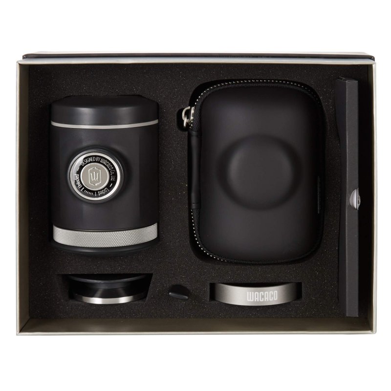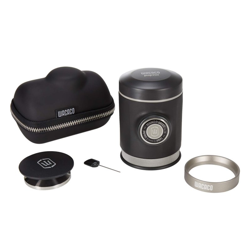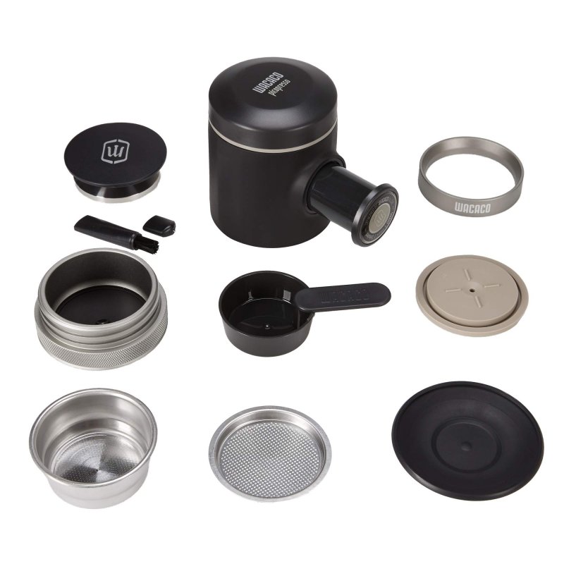 Eine Picopresso besteht aus: Wassertankdeckel, Trichter, Wassertank, Hauptkörper, Kolben, Auslaufdusche, Doppelfilterkorb, Siebträger, Siebträgerkopf, Siebträgerabdeckung. Hinzu kommen Zubehörteile wie Tamper, Messbecher, Verteilwerkzeug, Bürste. Alle Teile (inkl. Zubehör) werden kompakt im Gerät aufbewahrt und nehmen somit nur die winzigen Maße von 10,6 x 7,8 cm an. Um das edle Gerät beim Transport bestmöglich zu schützen, kannst du es im mitgelieferten Etui verstauen.