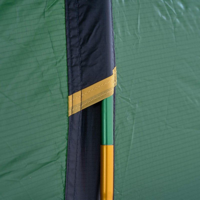 Durch das eingehängte Innenzelt, wird das Zelt in einem Rutsch mit dem Außenzelt aufgebaut. Das Gestänge ist außenliegend und wird durch farbcodierte Gestängekanäle geschoben. Der hintere Gestängebogen ist kürzer, wodurch eine aerodynamische, nach hinten abgeflachte Form entsteht. Diese Seite wird bei Sturm in den Wind gestellt, um wenig Windangriffsfläche zu bieten.