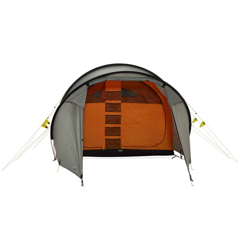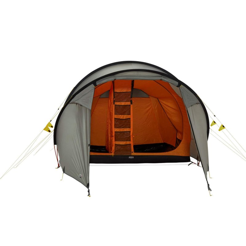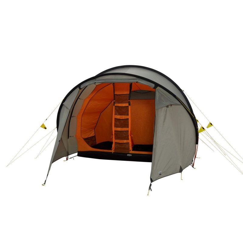 Tunnelzelt mit 180 cm Stehhöhe, das 3-4 Personen Platz bietet. Es eignet sich gut für kleine Familien und hat in der Apsis genügend Fläche für einen Tisch mit Stühlen.