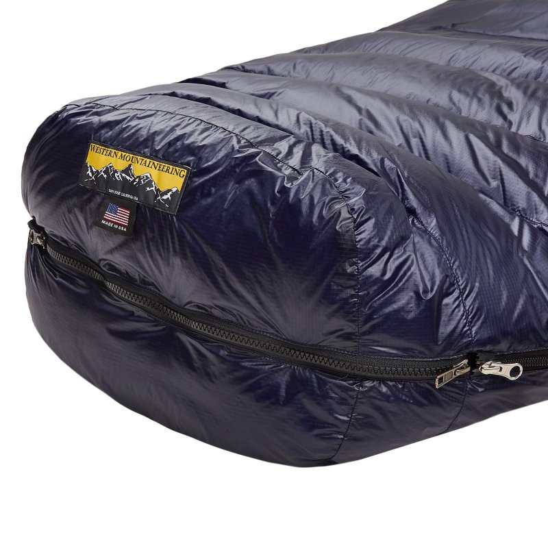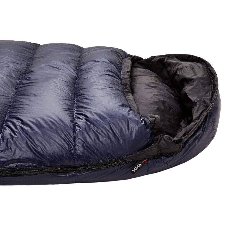 Western Mountaineerings Extremelite-Serie zeichnet sich durch ultraleichte Materialien aus. Das Außenmaterial aus 12D Ripstop Nylon ist daunendicht. Innen kommt 15D Nylon Taffeta zum Einsatz. Es ist herrlich weich und fühlt sich auch direkt auf der Haut angenehm an. Durch die schwarze Farbe heizt es sich schnell auf und trocknet dadurch beim Auslüften schneller.