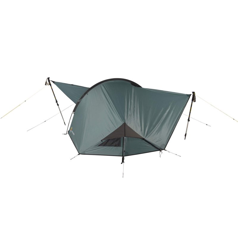 Zwei seitliche Eingänge erleichtern dir nicht nur den Zugang, sondern verbessern auch die Luftzirkulation. Die Eingangstür kann für zusätzlichen Wetterschutz und bessere Belüftung mit Trekkingstöcken zu einem kleinen Vordach aufgestellt werden.