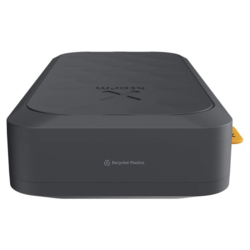 Das Gehäuse besteht größtenteils aus recyceltem Kunststoff und liegt dank der angenehmen Oberflächentextur gut in der Hand. Ein integriertes Digitaldisplay zeigt den Ladezustand der Powerbank präzise in Prozent an.