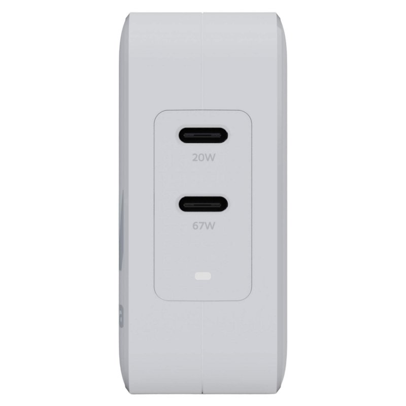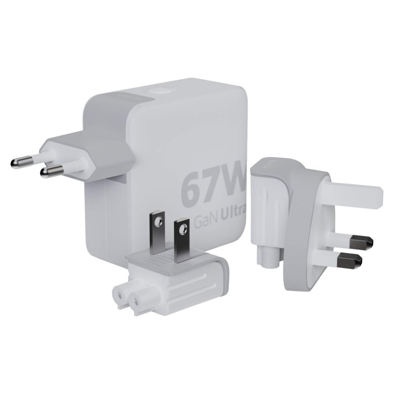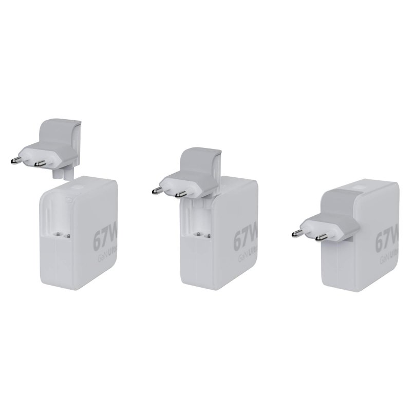 Der Adapter verfügt über zwei USB-C-Anschlüsse mit 20W und 67W. Dadurch kannst du unterwegs neben deinem Notebook gleichzeitig auch dein Smartphone oder Tablet aufladen. Der EU-Stecker kann werkzeugfrei gegen den beiliegenden US- oder UK-Stecker getauscht werden.
