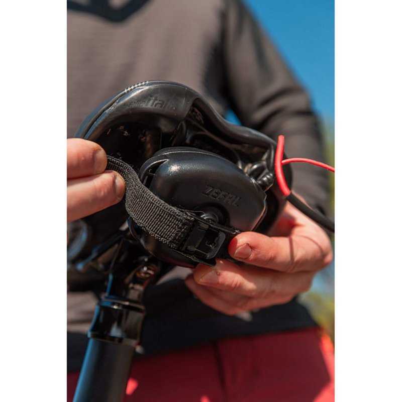 Ist die rote Schlaufe des Seils am Vorbau des Kinderfahrrads eingehängt, kann die Gespannfahrt losgehen. Gemeinsam könnt ihr so schwierige Steigungen spielerisch erklimmen und körperliche Unterschiede ausgleichen. Am Zielpunkt angekommen, lässt sich das Seil einfach vom Vorbau lösen. Per Automatik zieht es sich wieder ein. Sehr praktisch! Das Gehäuse des Bike Taxi - Bike Tow Rope lässt sich einfach per Riemen am Sattelgestell befestigen.